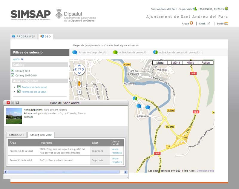 Quan entren al SIMSAP, els ajuntaments poden sol·licitar els programes que ofereix Dipsalut, fer el seguiment online de les actuacions que es van efectuant i consultar, a mesura que es van obtenint, els resultats que se’n deriven (analítiques, informes, dossiers tècnics…). Amb un sol cop d’ull, els consistoris poden conèixer aquestes informacions. Ho poden fer consultant per programa o de forma georeferenciada (sobre un mapa de la població es veuen aquells equipaments on s’hi porta a terme algun dels programes de Dipsalut, les accions concretes que s’hi fan i els seus resultats).
