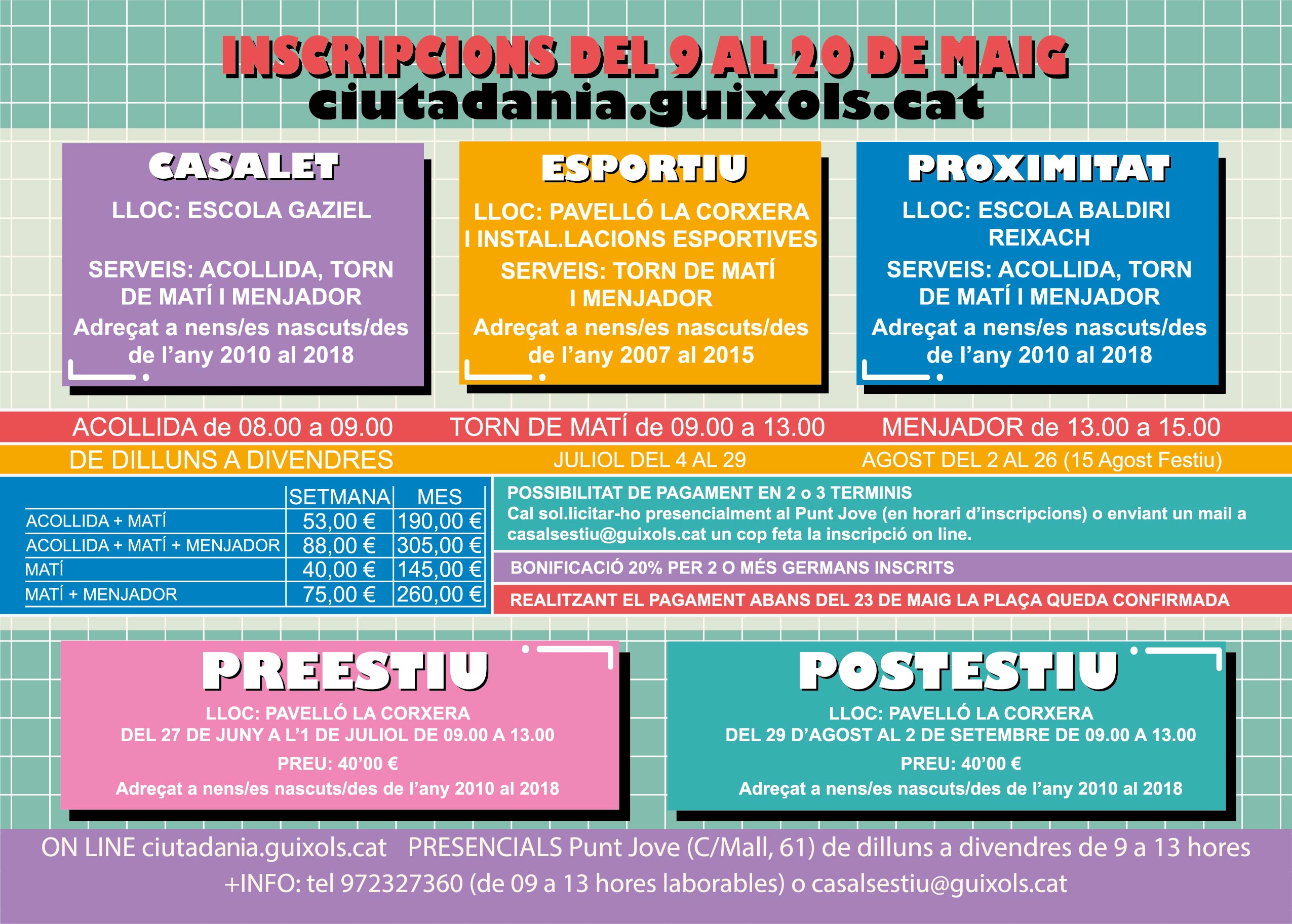 A partir del 9 de maig s’obren les inscripcions pels Casals d’Estiu de Sant Feliu de Guíxols, que estaran obertes fins el 20 de maig. Hi trobareu propostes com el Casalet, el Casal Esportiu, el de Proximitat i els de Preestiu i Postestiu.