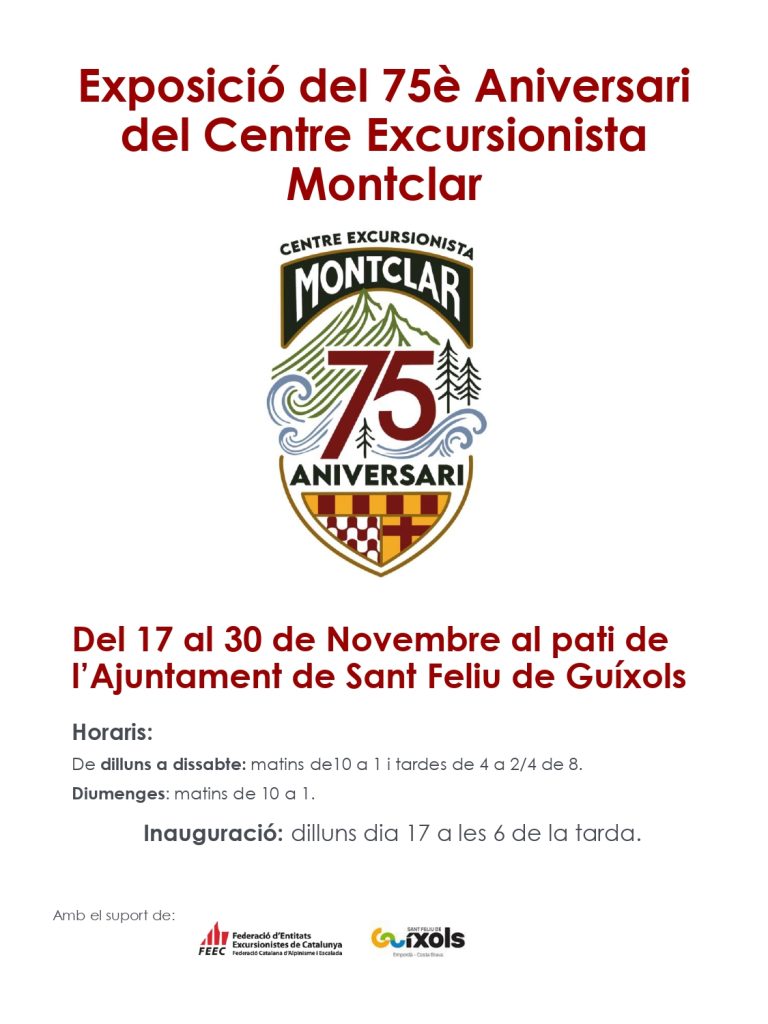 El Centre Excursionista Montclar celebra amb una exposició retrospectiva al pati de l’Ajuntament el seu 75è aniversari. La inauguració serà el dilluns dia 17 de de novembre a les 6 de la tarda i es podrà visitar fins el 30 de novembre.