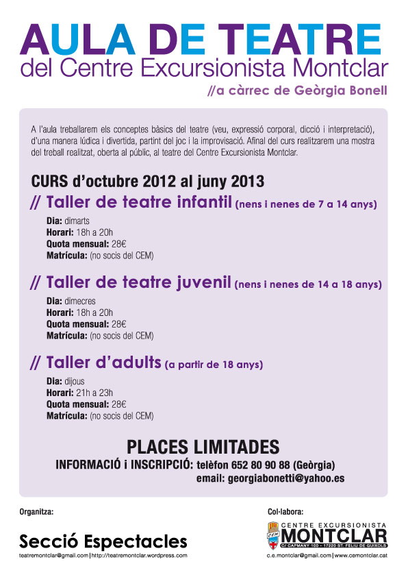 El Centre Excursionista Montclar (CEM) anuncia i informa als seus socis sobre la creació de l’Aula de Teatre on s’impartiran els tallers teatrals dirigits a nens i nenes, joves i adults durant el curs d’octubre 2012 al juny 2013.