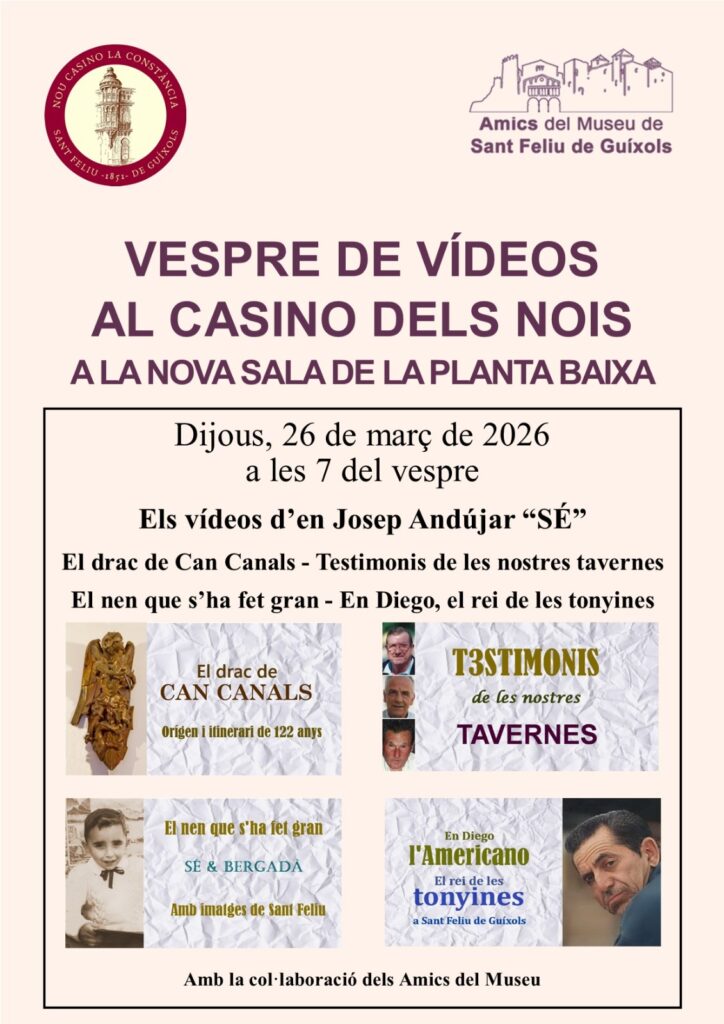 Aquest dijous torna una nova edició del “Vespre de vídeos al Casino dels Nois”. A partir de les 7 del vespre es podran veure 4 projeccions de films creats per Josep Andújar”, artista i gran coneixedor de la història de la nostra ciutat.