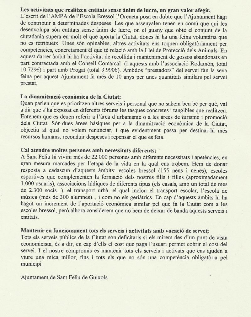 En la nota es surt en defensa de la resta d’entitats a les quals s’esmentava, i a la resta, a les quals es donen ajuts incidint en el fet que són entitats sense ànim de lucre que aporten a la ciutat molt més del que reben.