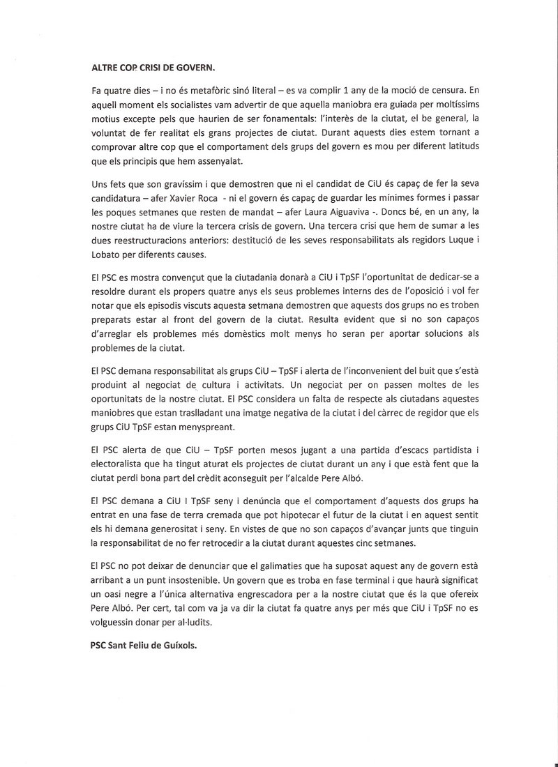 El PSC de Sant Feliu ha fet públic un comunicat en el qual qualifica de “gravíssim” el comportament dels grups (TSF i CIU) un any després de la moció que els va empènyer a l’oposició ja que considera que la proximitat de la data electoral està generant certs moviments que fan que, des del govern, s’estigui més pendents de les llistes que de l’acció de govern.