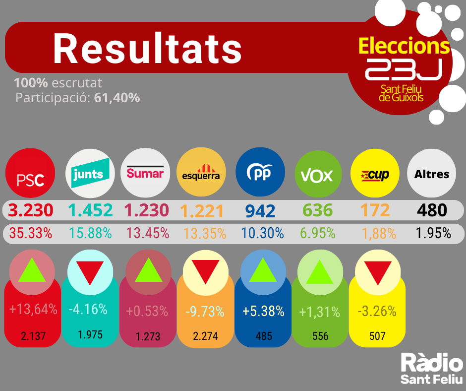 Esquerra és qui pateix una davallada més destacada a la nostra vila. Ha perdut un miler de vots respecte al 2019, amb una caiguda del 9.7% dels vots. El PP és la 4a força a Sant Feliu doblant resultats de fa 4 anys amb un 10% dels vots i 942 sufragis. També augmenta Vox que suma prop del 7% dels sufragis amb 636 vots.