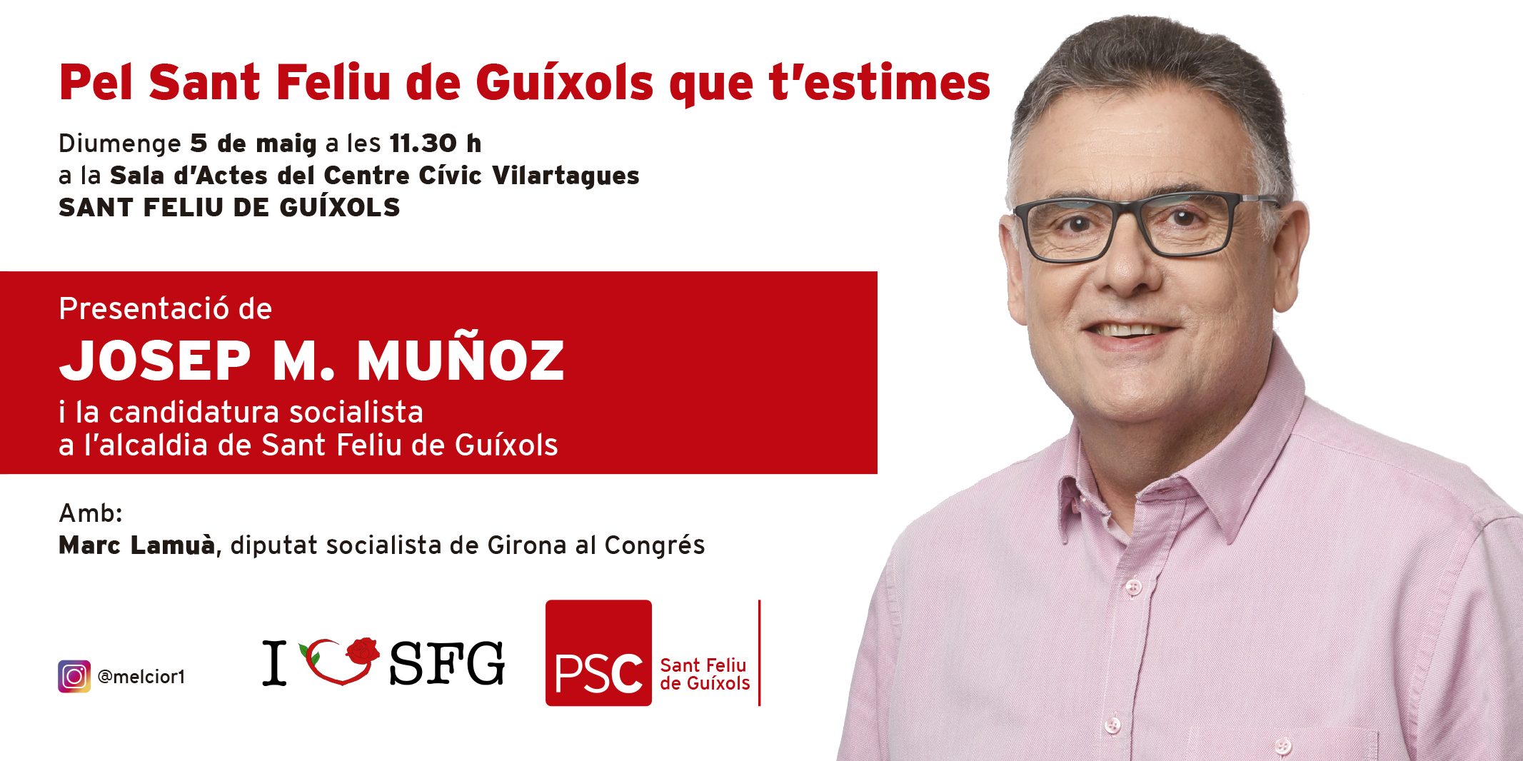 El PSC de Sant Feliu de Guíxols presentarà aquest diumenge, a les 11.30 hores a la sala d’actes del Centre Cívic Vilartagues, la seva candidatura per a les properes eleccions municipals del 26 de maig.