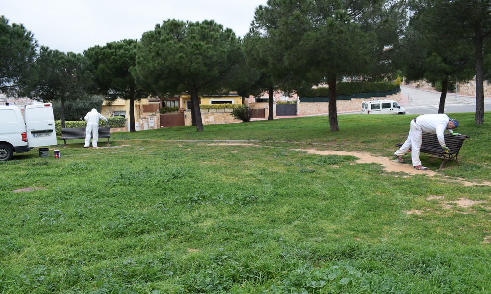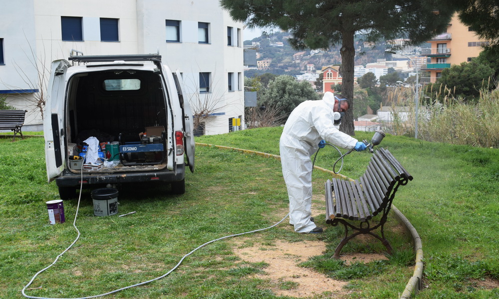 En aquesta ocasió, els pintors del servei de Brigada Municipal, treballen pintant els bancs de la plaça Geroni Basart que es troba a l’encreuament entre els carrers de Les Forques, Llevant i la carretera de Sant Pol de Sant Feliu de Guíxols.