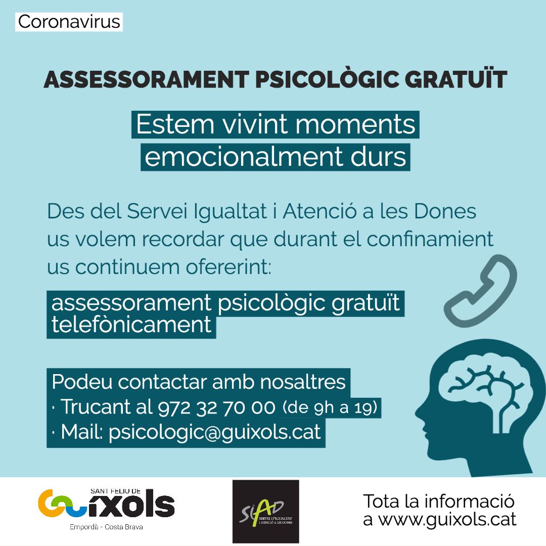 L’emergència sanitària que estem vivint i la situació de confinament durant setmanes pot provocar que algunes persones pateixin ansietat o se sentin afectades psicològicament per les circumstàncies. Des del Servei d’Igualtat i Atenció a les Dones de Sant Feliu de Guíxols s’ofereix tot l’any un servei psicològic gratuït a dones i homes, normalment de manera presencial, però ara han habilitat el servei telemàtic per poder atendre a tothom de manera telefònica i que ningú se sentí desatès aquests dies.