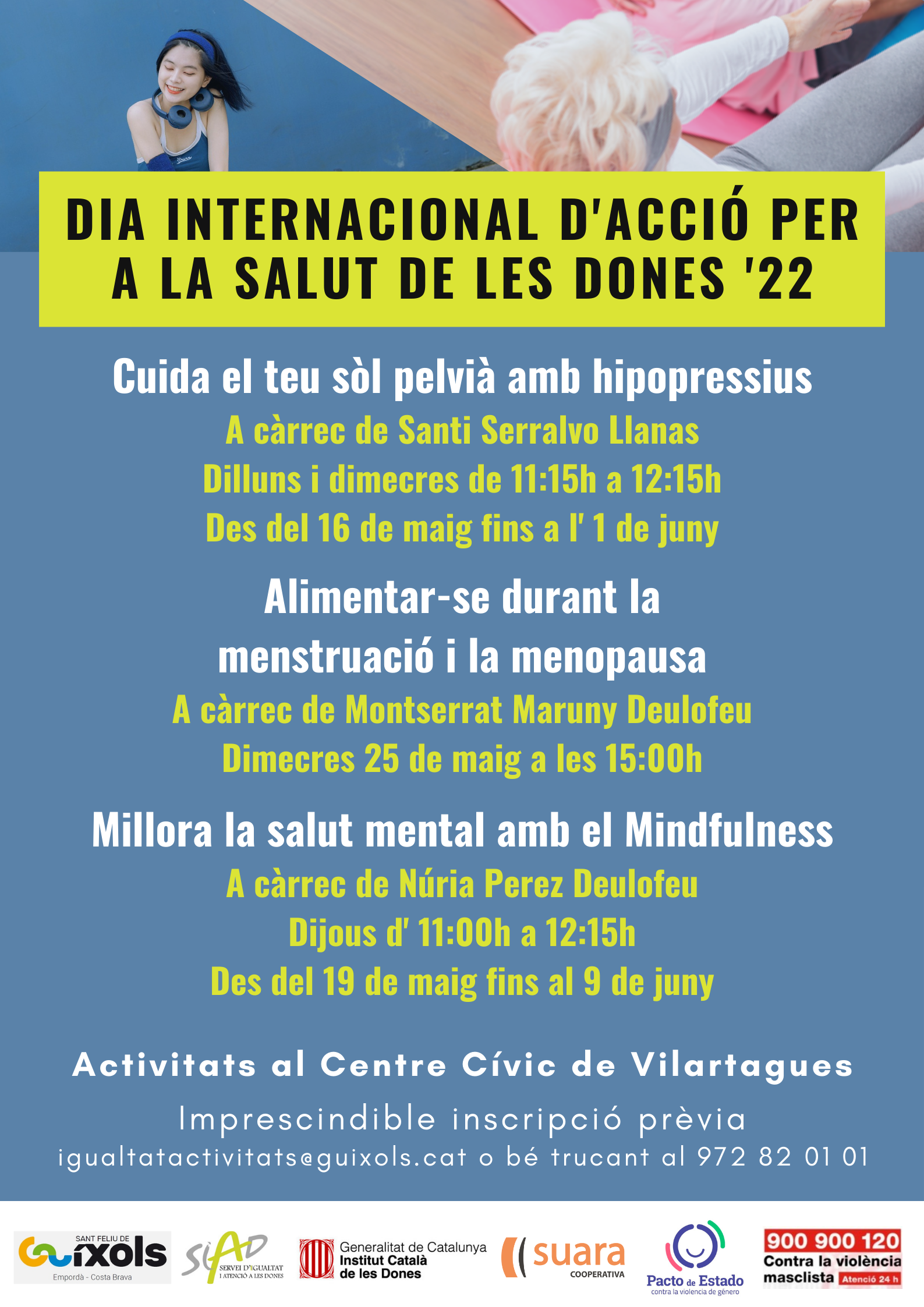 Hi trobareu activitats com ara ‘Cuida el teu sòl pelvià amb hipopressius’, ‘Alimentar-se durant la menstruació i la menopausa’ i ‘Millora la salut mental amb el Mindfulness’. Podeu consultar tota la informació a la imatge adjunta i us podeu inscriure a: