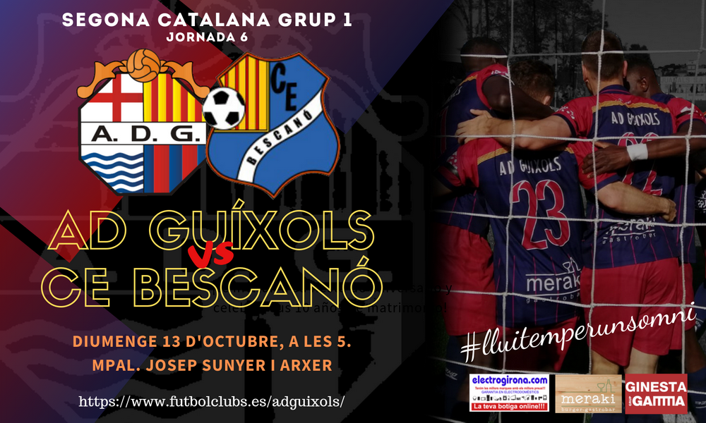 Aquest diumenge a partir de les 5 de la tarda, el Guíxols rep al Bescanó al camp Josep Sunyer i Arxer. El Bescanó fa dues temporades seguides que juga la promoció d’ascens a Primera Catalana.