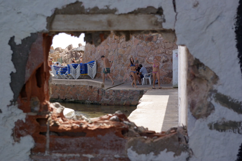 Una “finestra” quadrada d’uns 80 centímetres és el primer tros de paret que ha caigut, per obra d’unes mans anònimes, en el mur que barra el pas públic al camí de ronda de Can Rius, al ponent de la badia de Sant Feliu de Guíxols.