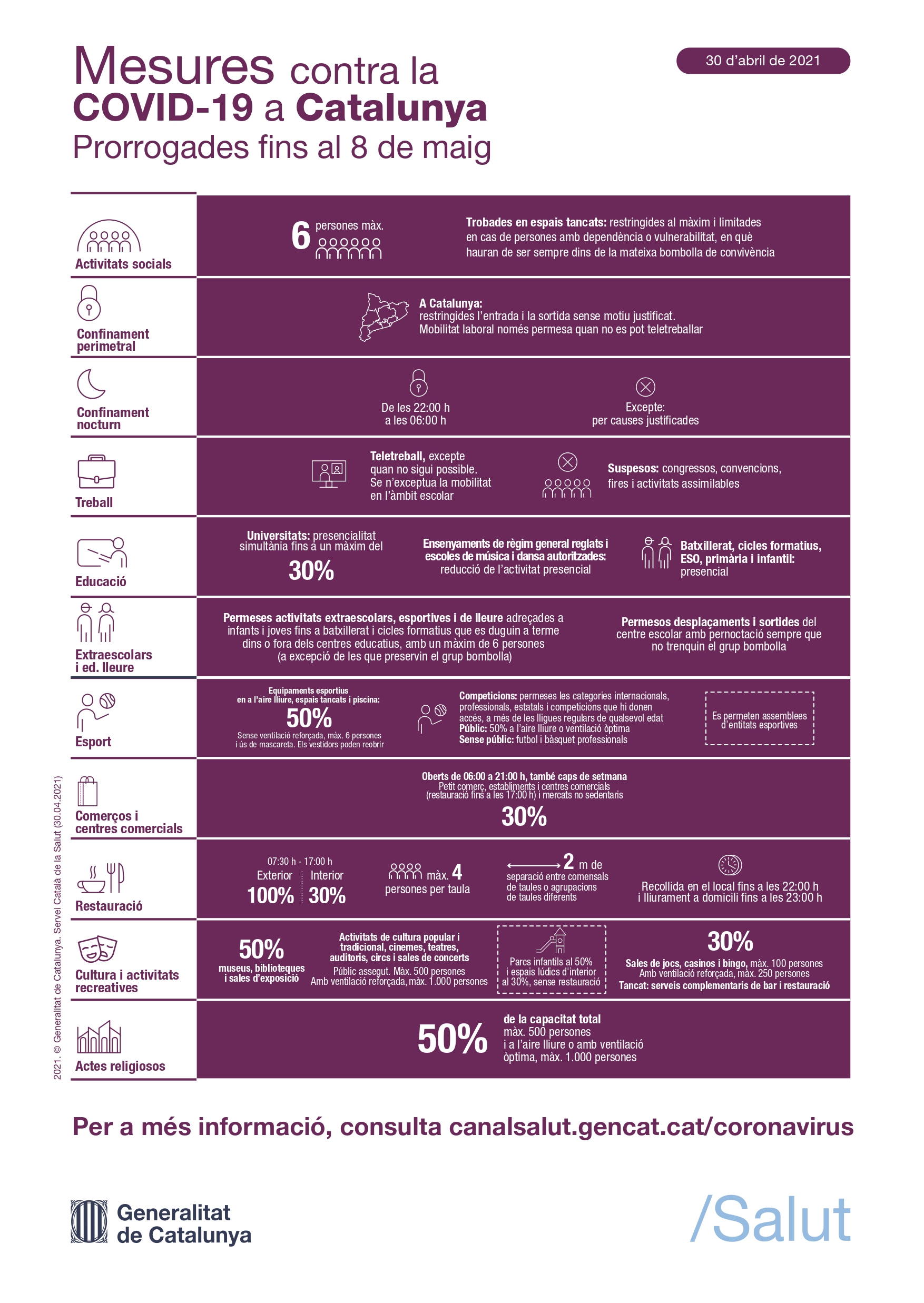 L’únic canvi que s’aplicarà a partir del dilluns 3 de maig serà que els ajuntaments podran tornar a decidir quan tancar els parcs infantils, que fins ara havien de tancar obligatòriament a les vuit del vespre. Les restriccions vigents, amb aquesta lleugera modificació, ho estaran sis dies més, en concret fins al 8 de maig.