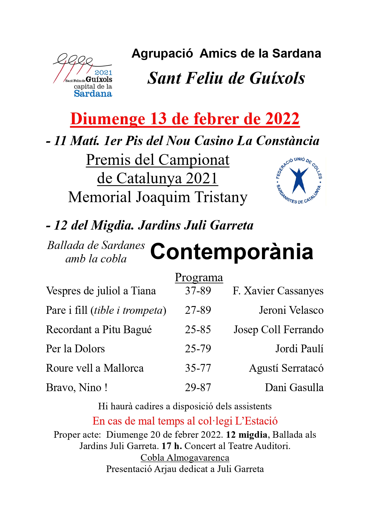 L’Agrupació Amics de la Sardana de Sant Feliu de Guíxols presenta la Festa Anual de les Colles Sardanistes que tindrà lloc el diumenge 13 de febrer. Entre les activitats s’hi troben els Premis del Campionat de Catalunya 2021, Memorial Joaquim Tristany, a les 11 del matí al Nou Casino La Constància.