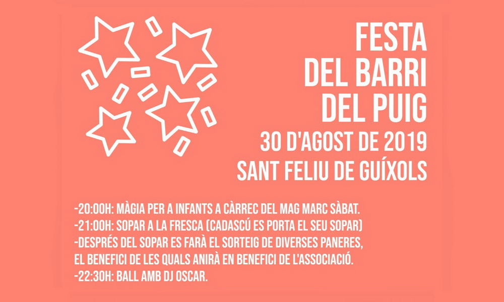 Avui divendres, partir de les 8 del vespre, tindrà lloc la Festa del Barri del Puig, que es farà a la Plaça del Puig.
