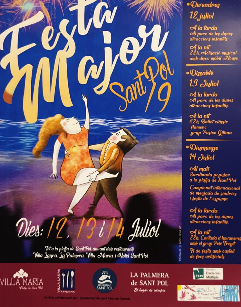 A partir d’aquest divendres 12 i fins els diumenge 14 de juliol, arriba una nova edició de la Festa Major de Sant Pol. Durant aquests 3 dies s’hi trobaran atraccions infantils de fira ubicades al Parc de Les Dunes. També hi haurà fira d’artesans i diverses actuacions, com ara el dia 12 de juliol amb disco mòbil Nouso a les 10 de la nit. El dia 13 a les 10 de la nit, serà el torn del ballet clàssic flamenc amb Pasión Gitana.