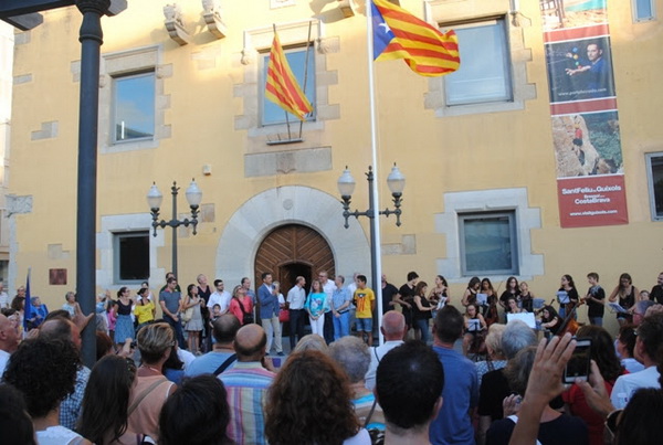 Un destacat nombre de persones es van acostar dijous a la tarda a la plaça del Mercat de Sant Feliu de Guíxols, davant l’Ajuntament, per assistir a l’acte institucional d’hissada de la bandera estelada en el masteler situat davant de la façana de la casa consistorial.