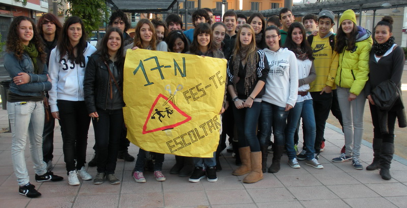 Un grup d’estudiants de l’IES Sant Elm que s’havien afegit a la vaga que les universitats i centres de secundària catalans han celebrat aquest dijous en protesta per les retallades en educació, es varen manifestar a la porta de l’Ajuntament portant una pancarta i fent sentir la seva veu a la plaça del Mercat.