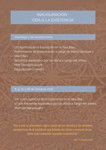 Aquest diumenge dia 2 d’octubre a les 5 de la tarda a La Nau Blau, s’inaugura l’exposició de pintures a l’oli “Oda a l’existència” de Mathew Denegrevaught. El pintor amb arrels aquí, a Escòcia i a Mèxic, presentarà la seva mostra amb una performance de dansa i música a càrrec de Marta Gàzquez i Olec Mun i un recorregut explicatiu de l’artista sobre la seva obra.