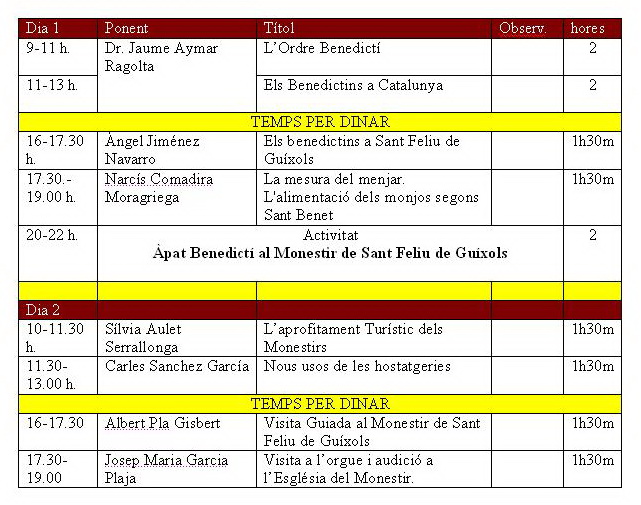 El curs realitza una immersió al món benedictí des d’un punt de vista històric i que ens portarà finalment fins al present i a l’aprofitament turístic i de coneixement que ens poden aportar els monestirs com a elements religiosos o com a elements del patrimoni cultural. El curs abordarà els temes següents: els benedictins a Catalunya i a Sant Feliu de Guíxols, la vida quotidiana i l’alimentació als monestirs benedictins, l’aprofitament turístic dels monestirs i els nous usos de les hostatgeries. També s’oferirà una visita guiada al monestir i a l’orgue, amb una audició a l’església del monestir, i un àpat benedictí el dia 6 de juliol al vespre.