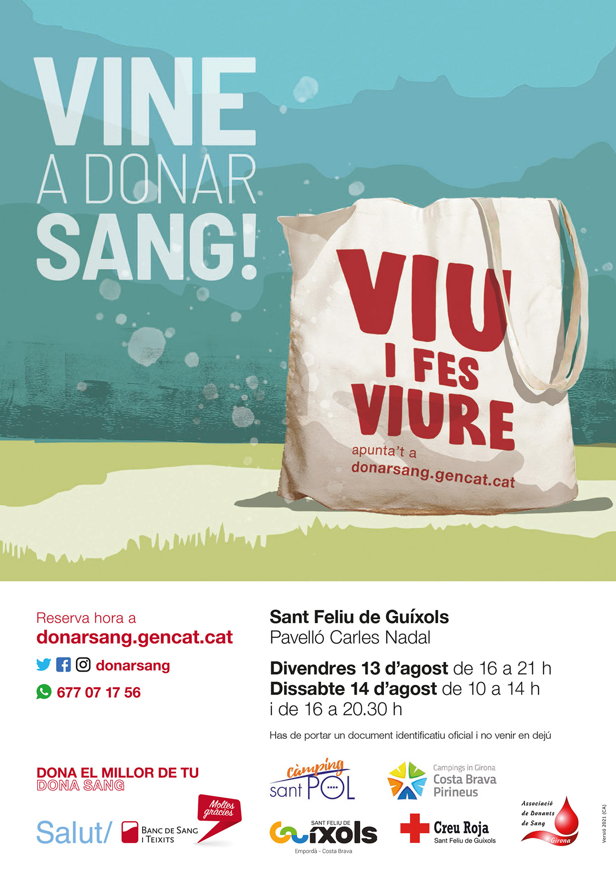 Els propers 13 i 14 d’agost, tindrà lloc una campanya de donació de Sant, que s’ubicarà al Pavelló Carles Nadal i Cosp. La donació del divendres es farà de 16 a 21 hores i la del dissabte, de 10 a 14 hores i de 16 a 20.30 hores. Ja us hi podeu apuntar en els següents enllaços: