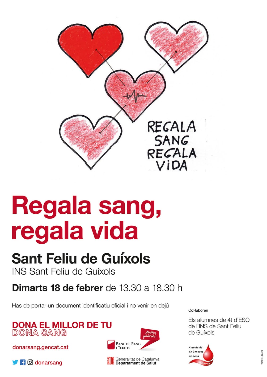El proper dimarts 18 de febrer de 13:30h a 18:30h a l’Institut de Sant Feliu de Guíxols es durà a terme una jornada de donació de sang organitzada pel Banc de Sang i Teixits amb la col·laboració dels alumnes de 4t d’ESO de l’institut de Sant Feliu de Guíxols.