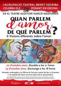En la celebració dels seus 36 anys, l’Agrupació Teatral Benet Escriba interpretarà de nou l’obra de teatre ‘Quan parlem d’amor, de què parlem’ que es podrà veure al Teatre Auditori Narcís Masferrer els dies 22 i 23 d’octubre. Roser Descayre, presidenta de l’entitat, ens explica la proposta.