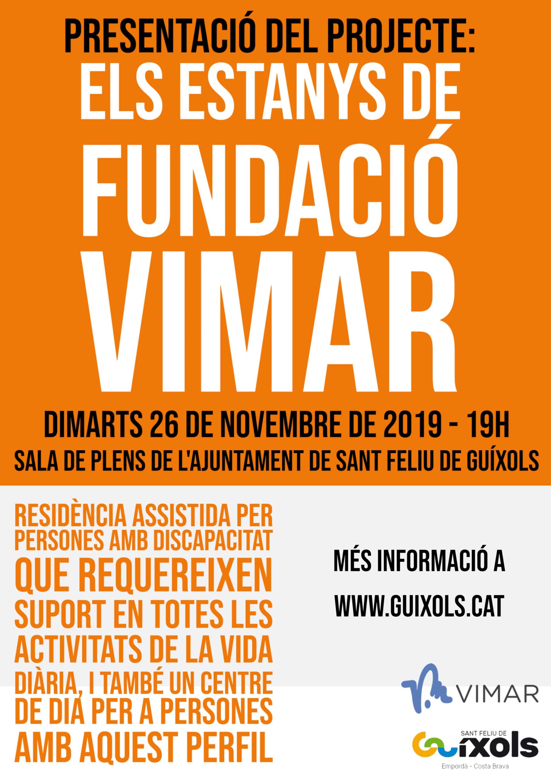 El projecte Els Estanys, la nova residència per a persones amb discapacitat que es construirà a Platja d’Aro, es presentarà dimarts 26 de novembre a Sant Feliu de Guíxols. Serà a les 19:00 hores a la Sala de Plens de l’Ajuntament, i hi intervindran Jordi Sistach, vicepresident de la Fundació Vilagran-Maristany (VIMAR), i Carles Motas, alcalde de la població ganxona