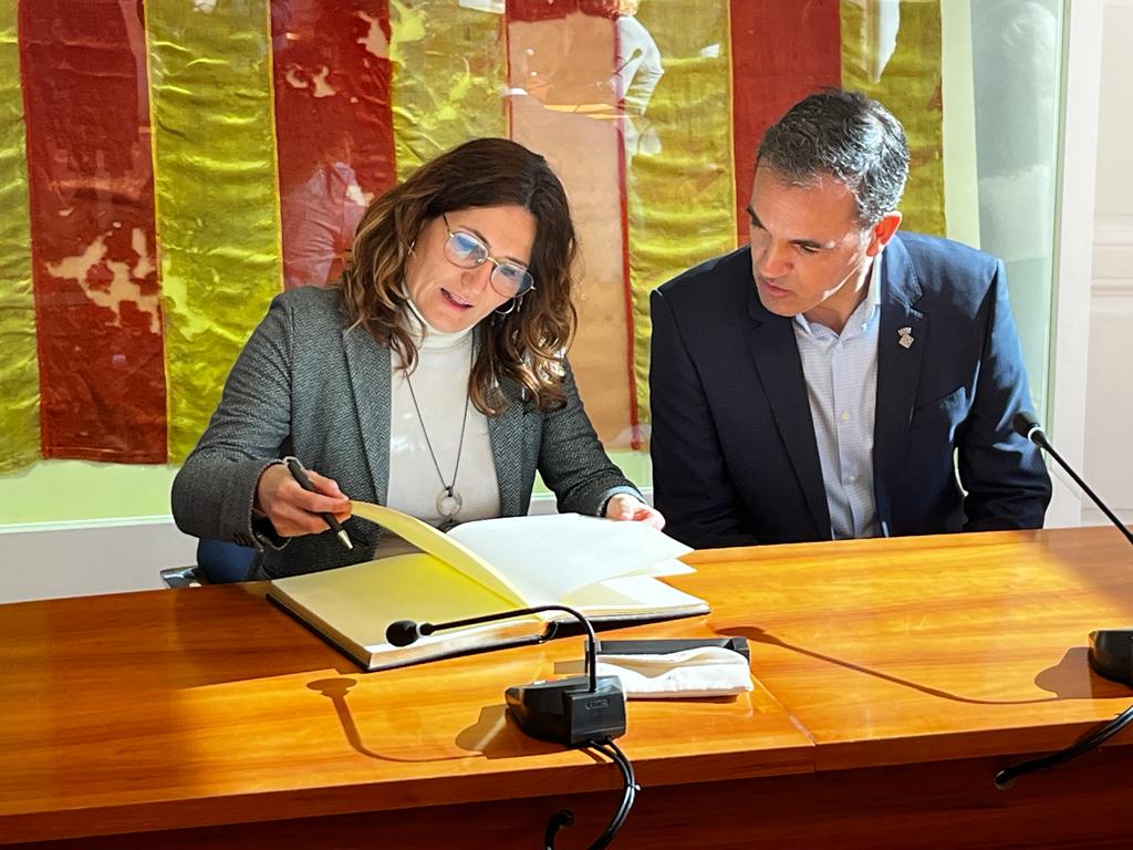 La consellera Viladrà signant al llibre d’honor al costat de Motas. RSF