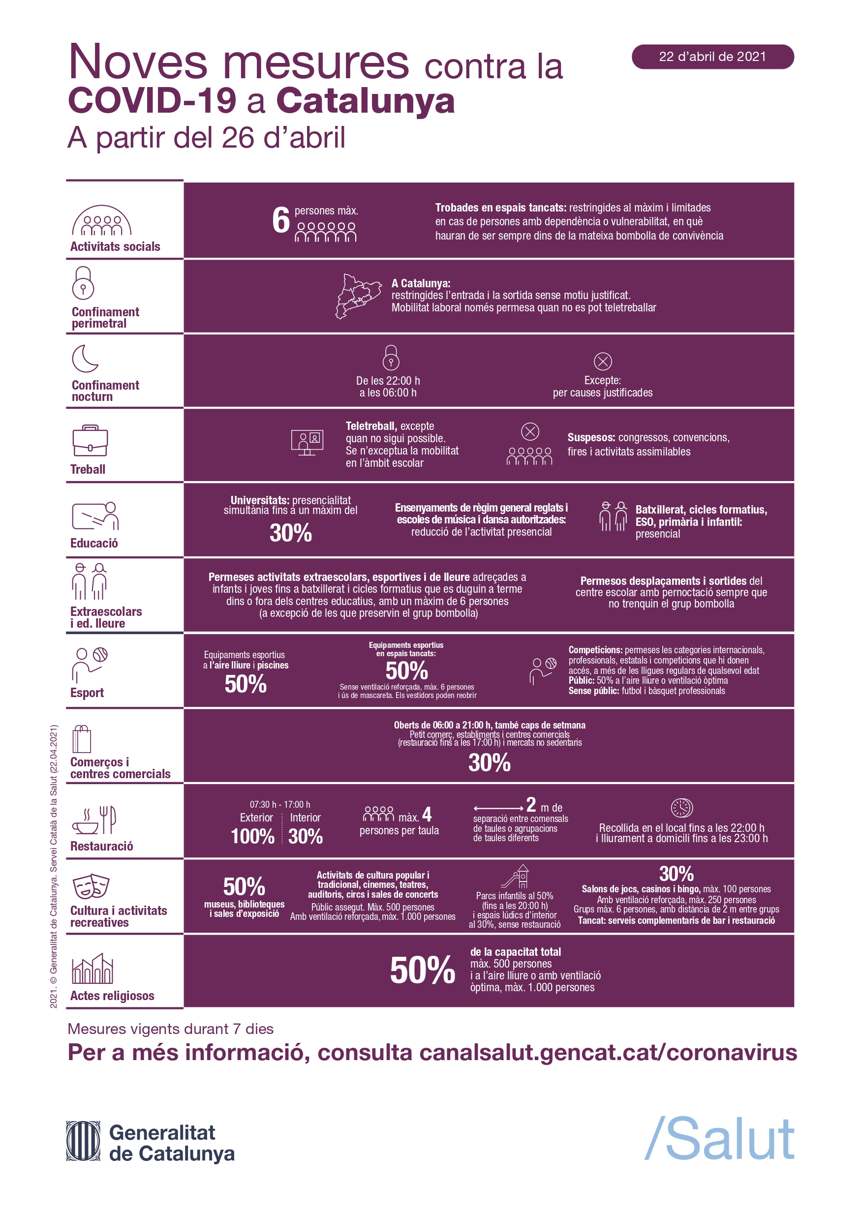 El nou paquet de mesures entrarà en vigor el proper dilluns, 26 d’abril de 2021, i tindrà una vigència mínima de set dies, fins al dilluns, 3 de maig. A continuació, repassem com queda el context restrictiu a Catalunya.