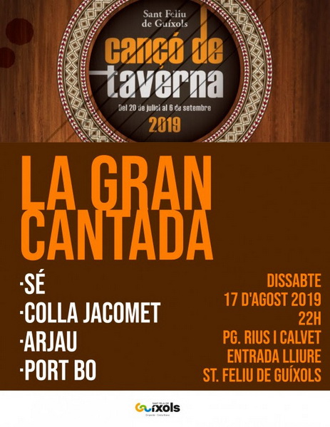 Demà dissabte 17 d’agost tindrà lloc a Sant Feliu de Guíxols una nova edició de la Gran Cantada que s’emmarca dins el Cançó de Taverna d’enguany. La mostra s’allarga fins el 6 de setembre.