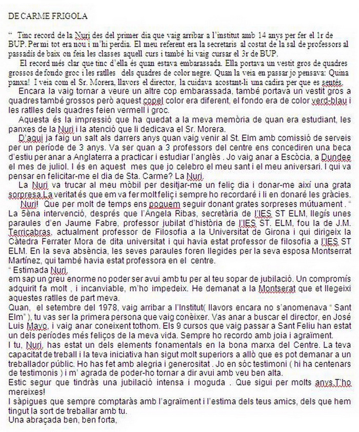 Totes les intervencions lloaren la trajectòria i la dedicació de la Nuri en cos i ànima a l’Institut el qual ella s’hi sentia com a casa seva. Han estat 43 anys de servei i ara és el moment de dir adéu.
