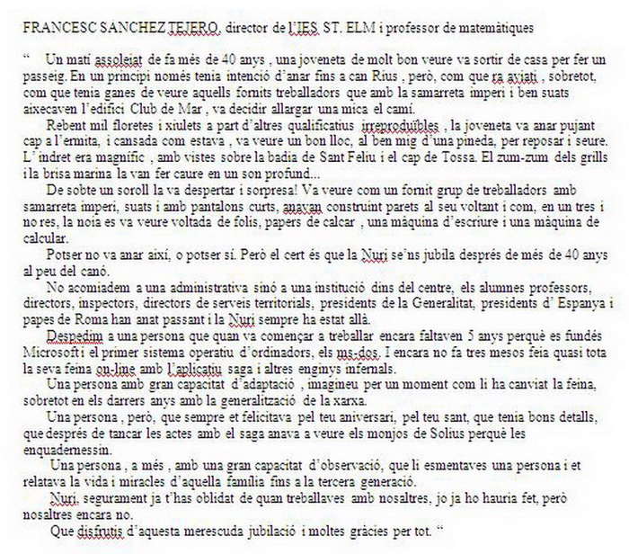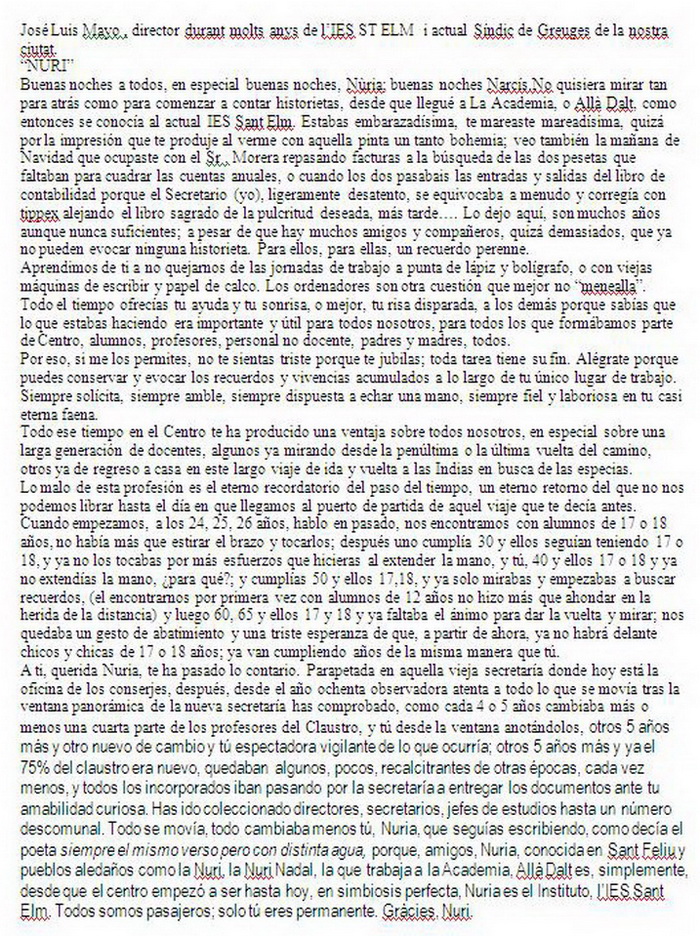 Fa uns dies es va celebrar un comiat especial, per jubilació, de Nuri Nadal, “la Nuri” per tota la comunitat educativa de l’IES Sant Elm, “l’Institut.”