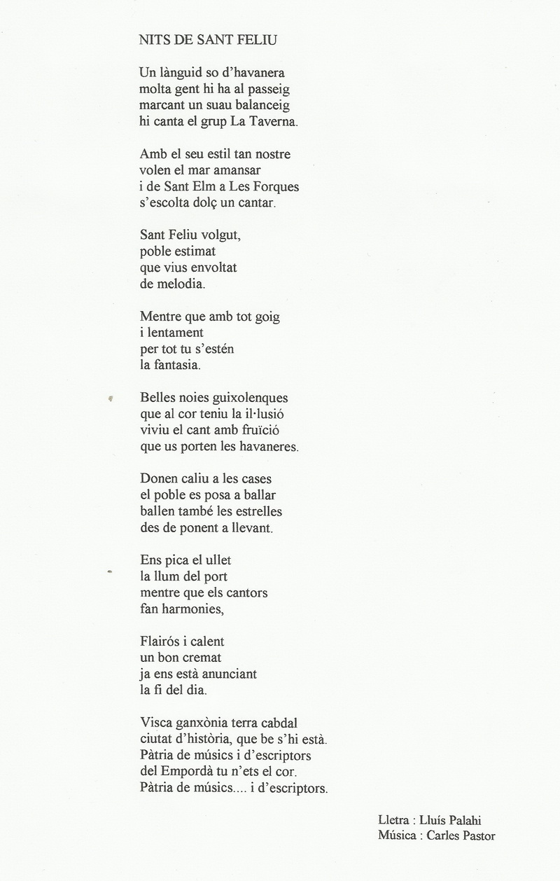 En començar l’actuació, el grup La Taverna, interpretarà una havanera composta pel polifacètic i il·lustre guixolenc, Lluís Palahí, anomenada “Nits de Sant Feliu”, musicada per Carles Pastor i de la qual, us avancem la lletra.