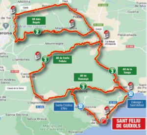 La primera etapa de la Volta té inici i final a Sant Feliu, en concret la sortida neutralitzada serà a les 12.55h des del Guíxols Arena i amb arribada cap a les 16h de la tarda a la rambla Joan Bordàs.