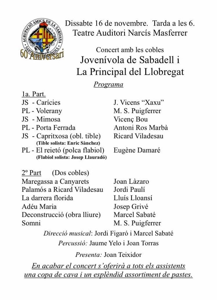 La celebració d’aquest aniversari comptarà amb dues cobles de primer nivell: la Jovenívola de Sabadell, amb direcció de Jordi Figaró, i la Principal del Llobregat, amb direcció de Marcel Sabaté. Els dos concerts tindran lloc el dissabte a les 6 de la tarda al Teatre Auditori Narcís Masferrer, en un acte presentat per Joan Teixidó.