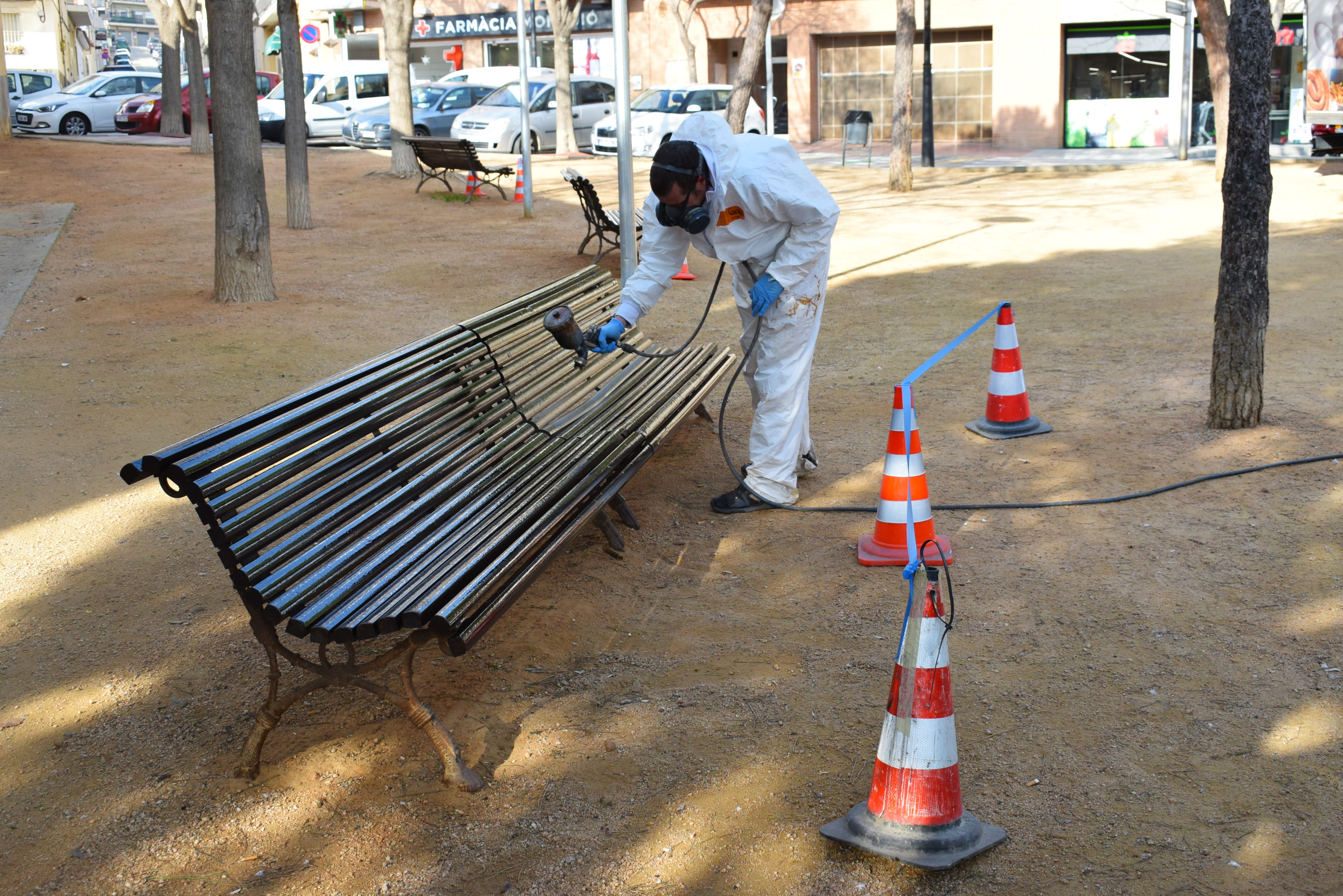 Un operari de la brigada treballa en els bancs del parc de la cruïlla entre el carrer Rufo i l’avinguda Canàries.
