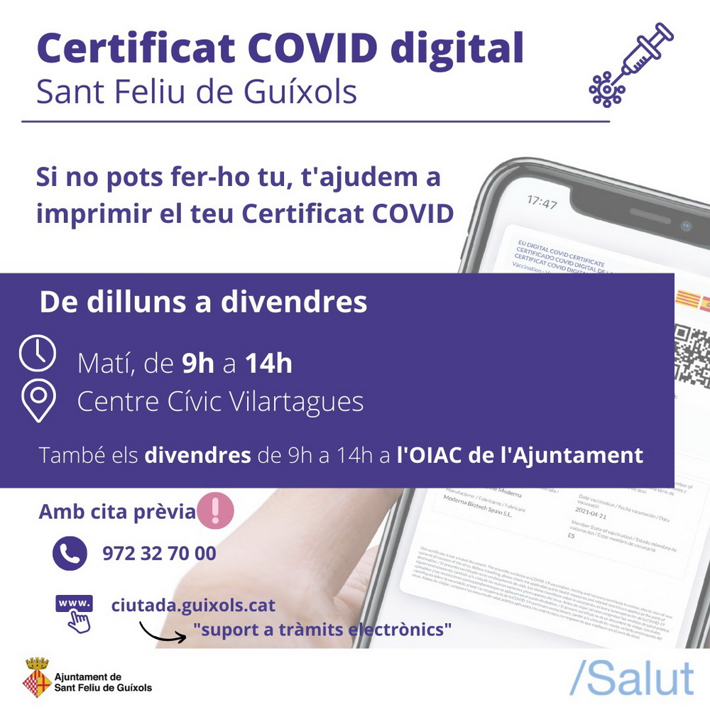 L’Ajuntament de Sant Feliu de Guíxols posa a disposició dels ciutadans ajuda per el certificat COVID digital.