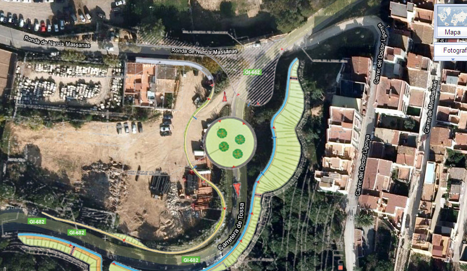 Un d’aquest giratoris (i també el més car ja que es pressuposta en 600.000 euros) és el que es preveu uns metres abans de l’encreuament de la carretera de Tossa amb l’Avinguda Narcís Massanas que té una triple funció; racionalitzar el trànsit, restringir-lo en el tram de carretera (que passaria a ser carrer) del futur museu Thyssen, desviant-lo cap al giratori de l’estació d’autobusos i comptar amb una arribada al municipi que, visualment, sigui més atractiva.