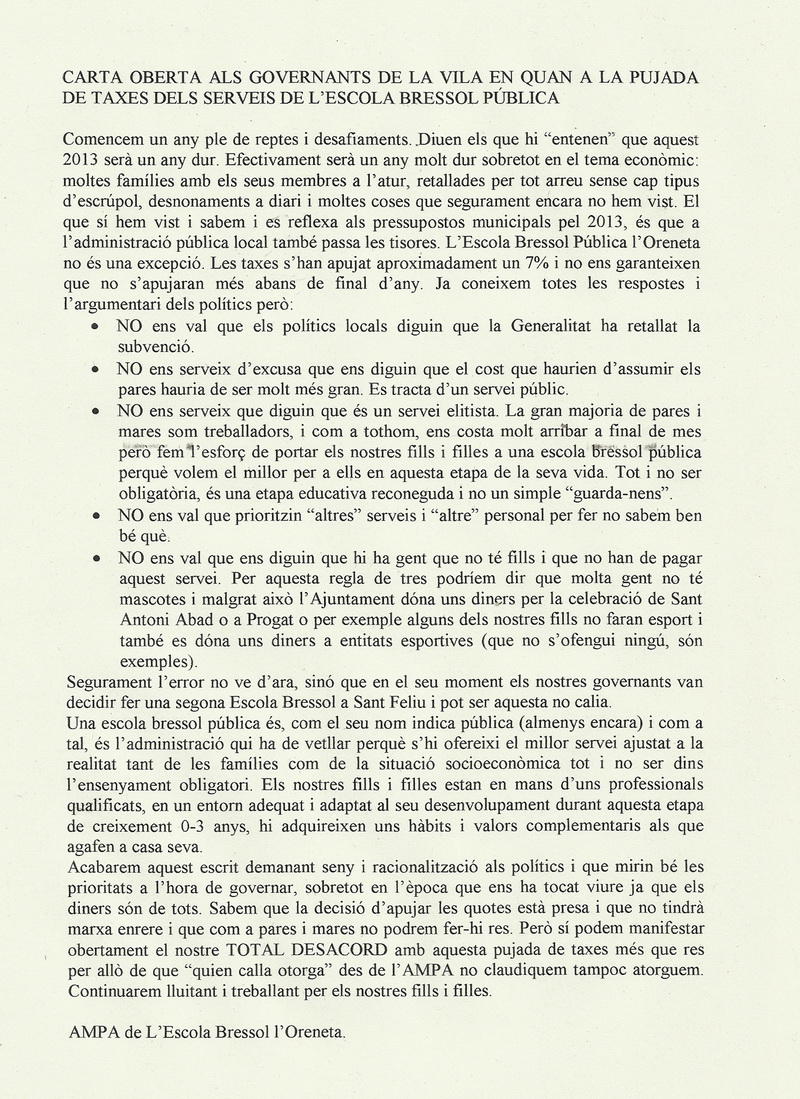 L’Associació de Mares i Pares d’Alumnes (AMPA) de l’Escola Bressol Pública Oreneta han enviat una carta oberta als mitjans en la qual es mostren contraris a la puja de taxes aprovada pel consistori (+6’9%), justificada, des de l’equip de govern, per la baixada considerable de les subvencions de la Generalitat des de fa tres anys, passant de 1.800 € a 1.300 €/any per alumne i que pel 2013 encara està per determinar.