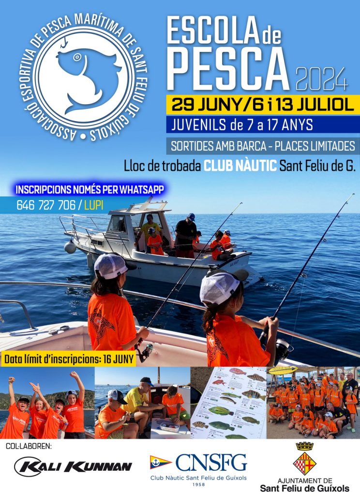 L’Associació Esportiva de Pesca Marítima de Sant Feliu de Guíxols ha obert les inscripcions per la cinquena edició de l’Escola de Pesca que tindrà lloc a la nostra ciutat els dies 29 de juny i 6 i 13 de juliol. La iniciativa està dirigida a joves d’entre 7 i 17 anys i consisteix en diverses sortides en barca des del Club Nàutic.