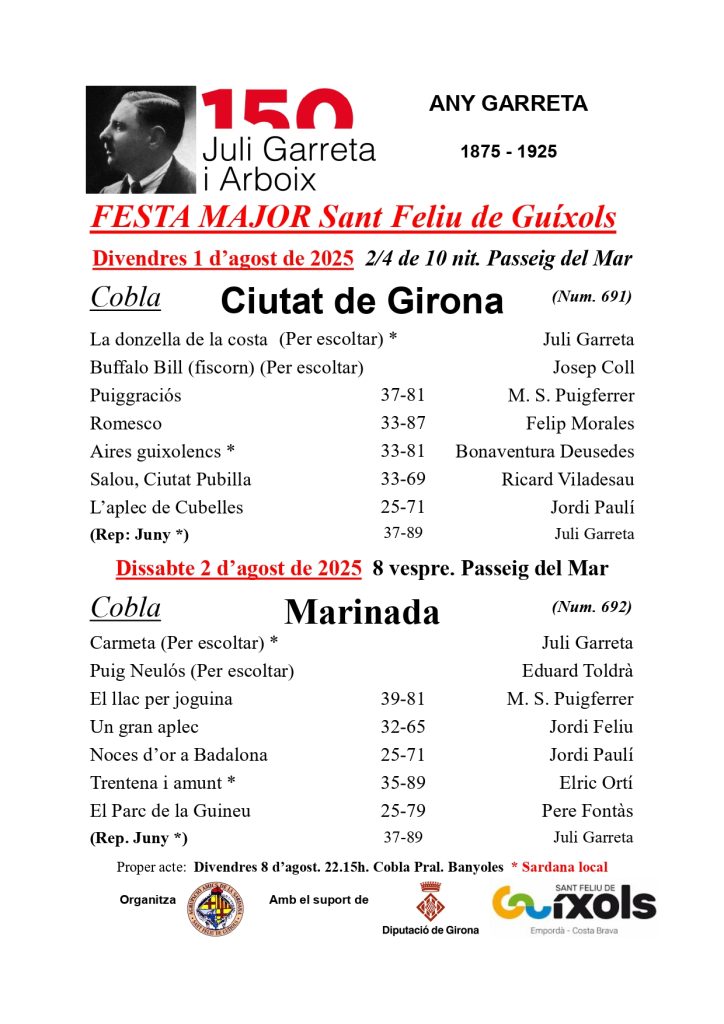 L’Agrupació Amics de la Sardana ja té a punt les dues ballades de la Festa Major que estan organitzades amb la col·laboració de l’Ajuntament de Sant Feliu i la Diputació de Girona.