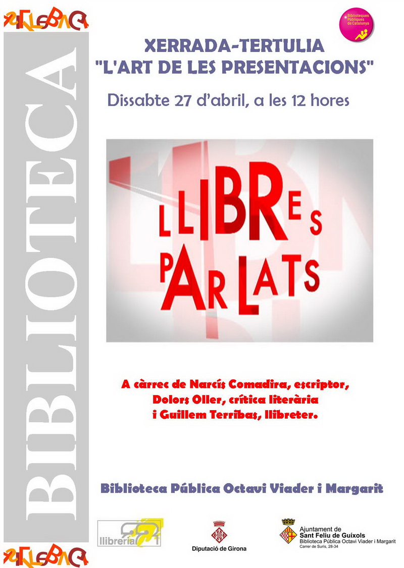 Parlar de llibres és també un dels plaers de la lectura. Aquesta exposició, que es podrà visitar fins al 30 d’abril al vestíbul de la Biblioteca Pública Octavi Viader i Margarit, segueix tres dècades de presentacions de llibres (del 1978 al 2008) organitzades per la Llibreria 22 de Girona i recull el testimoni que en va conservar la càmera del llibreter Guillem Terribas.