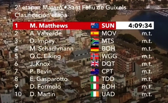 Michael Matthews, del Team Sunweb, ha estat qui ha pujat al primer lloc del podi en la segona etapa de la 99 Volta Ciclista a Catalunya que ha arribat aquesta tarda a Sant Feliu de Guíxols provinent de Mataró.