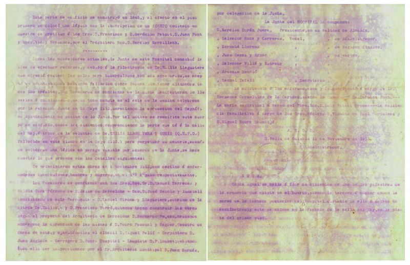 Dadas las necesidades actuales, la Junta de este Hospital concibió la idea de efectuar reformas, y debido a la filantropia de Emilia Llagustera que ofreció costear las salas para tuberculosos con sus accesorios, se aceptó en principio mas habiendo fallecido dicha Señora sin tener ultimados todos los trámites, los Herederos de confianza de la misma manifestaron lo llevarían a cumplimiento, segun todo consta en el acta de la sesion celebrada por la referida Junta en 25 Mayo 1913, mereciendo la aprobacion del magnífico Ayuntamiento en sesion de lo Junio. Por tal motivo se reedifica este cuerpo de edificio, desde los cimientos, comprendiendo la parte que dá á la calle del May, á tenor de la voluntad Da. EMILIA LLAGUSTERA I SURIS (Q.E.P.D.) fallecida en esta ciudad en 14 Mayo 1913. Y para perpetuar su memoria además de colocarse una lápida en paraje visible por acuerdo de la Junta, se hace constar lo que precede con los detalles siguientes: