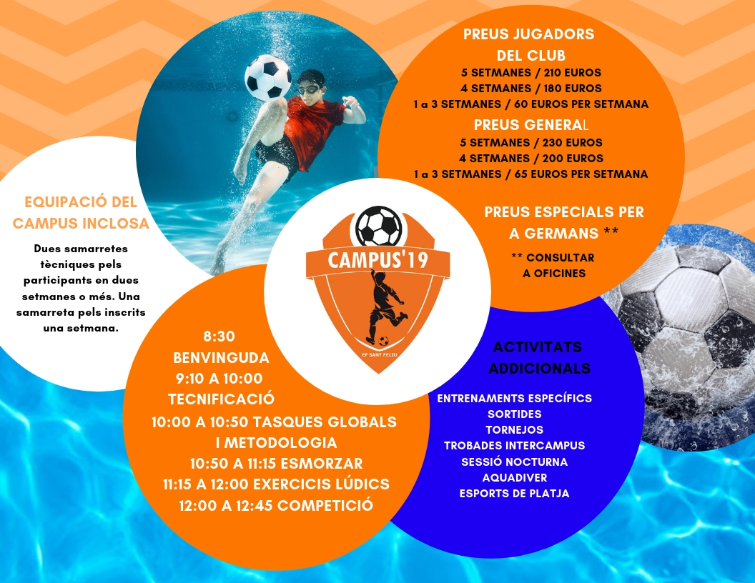 L’Escola de Futbol Sant Feliu organitza un any més un campus d’estiu dirigit a totes les nenes i nens que volen mantenir el contacte amb aquest esport durant les vacances estiuenques. Aquesta és una proposta que s’ha portat a terme en els darrers 8 anys.