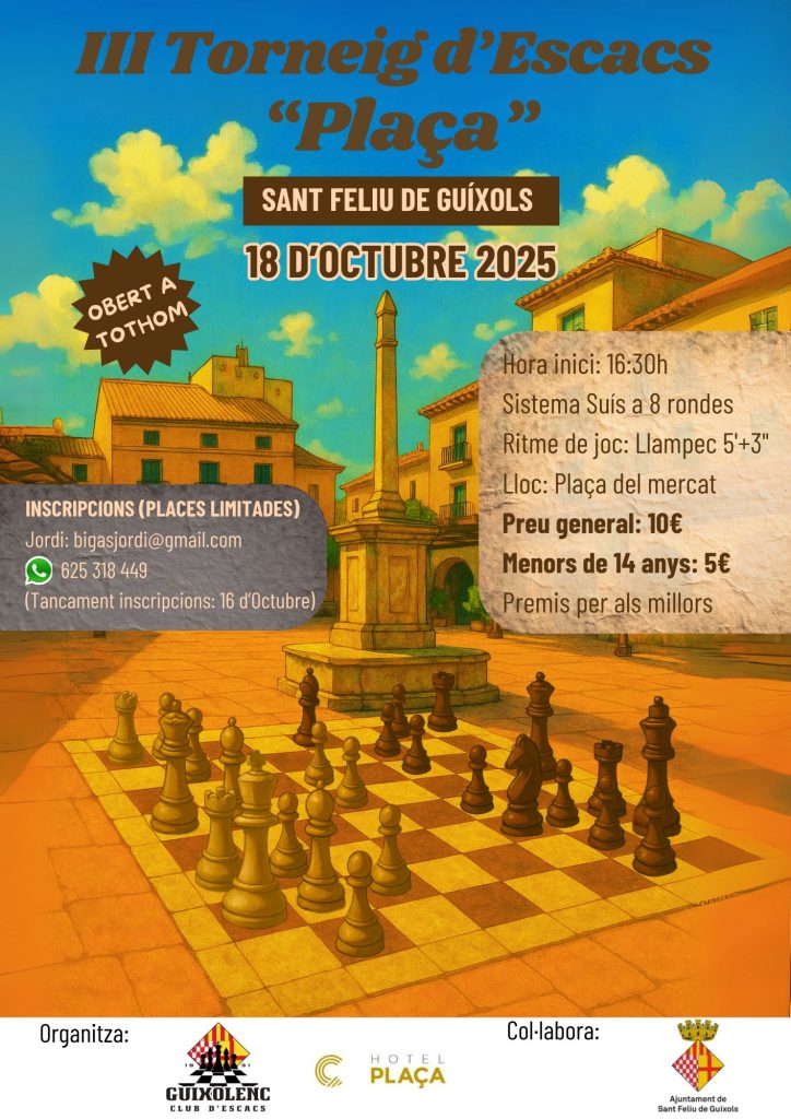 El Club Guixolenc d’Escacs i l’Hotel Plaça ja tenen a punt una nova edició, la tercera, del Torneig d’Escacs Plaça. L’activitat se celebrarà el 18 d’octubre a la Plaça del Mercat 1 d’Octubre a partir de les 16.30 hores i les inscripcions ja estan obertes, tan per a federats com a aficionats.