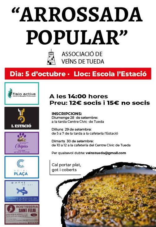 L’Associació de Veïns de Tueda ha obert les inscripcions per a la l’arrossada popular que se celebrarà aquest diumenge 5 d’octubre a les 2 de la tarda a l’Escola l’Estació.