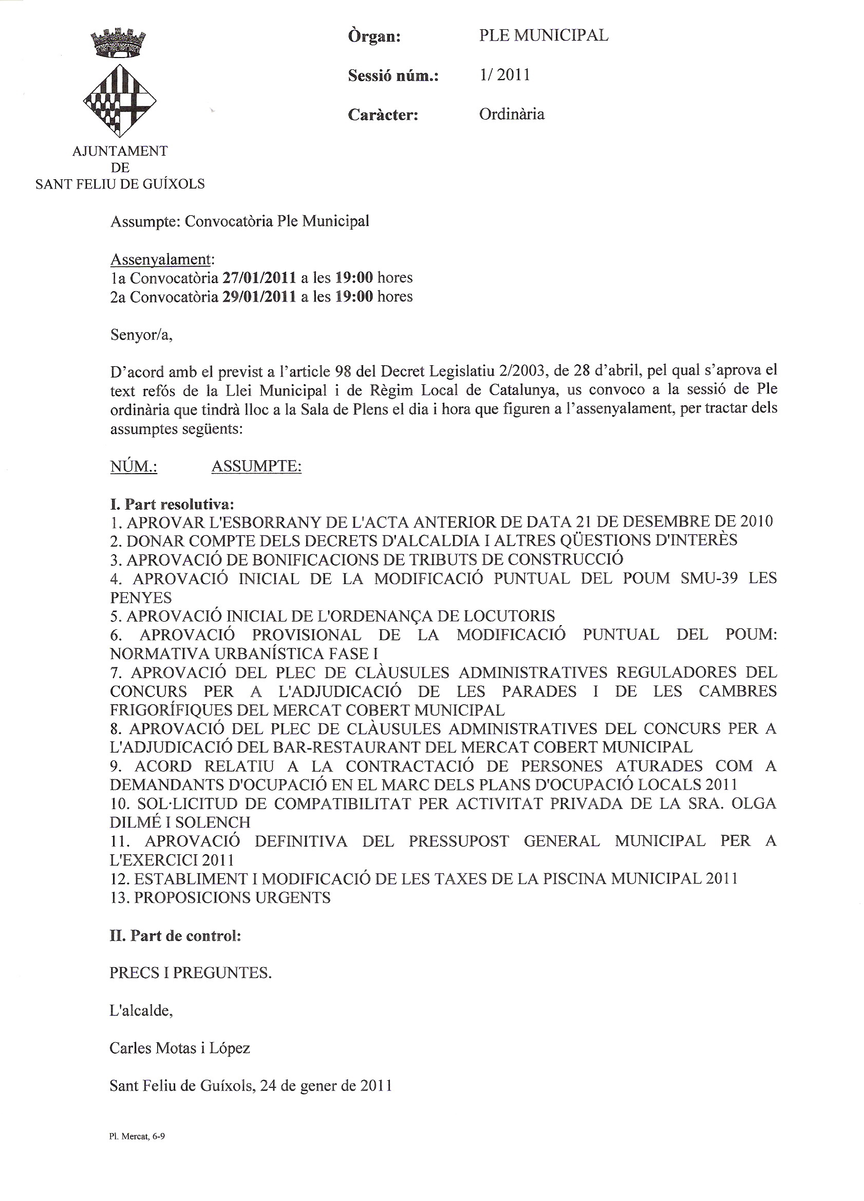 Ordre del dia del ple ordinari d’aquest mes de gener