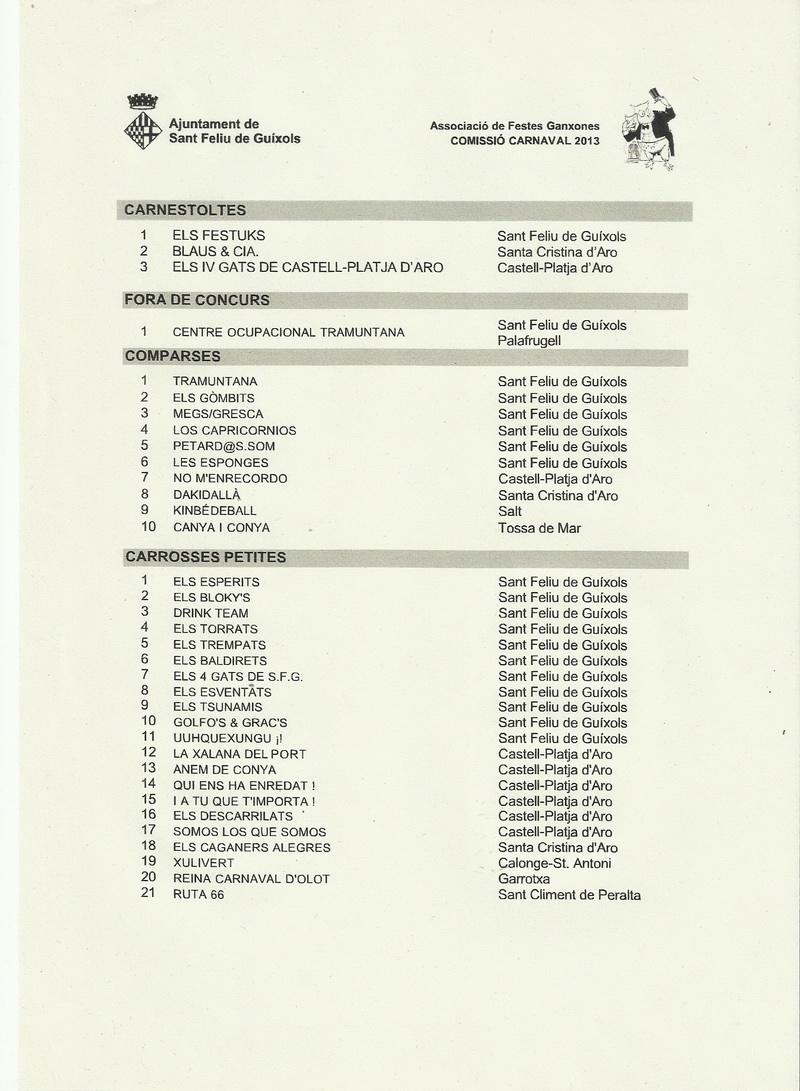 A finals del mes de novembre, l’organització del Carnaval 2013, de Sant Feliu de Guíxols, va fer públiques les bases de participació a la Rua del divendres de Carnaval tot destacant que, per poder-hi participar, calia fer la preinscripció a més d’altres condicions i suggeriments per a un millor desenvolupament d’aquest esdeveniment que se celebrarà el proper 8 de febrer i, tot seguit, calia omplir una butlleta a presentar amb la data límit del 18 de gener.