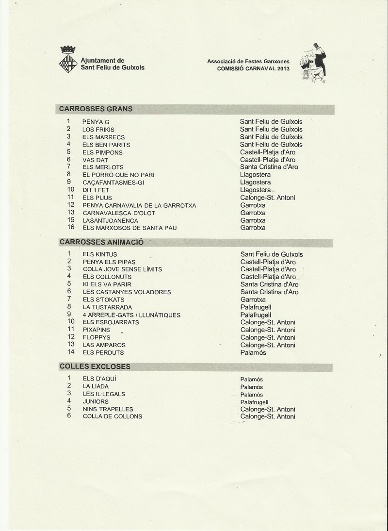 També s’indicava que, inicialment, s’admetrien 20 places per carrosses petites, 20 per carrosses grans, 10 per comparses i 10 per carrosses d’animació, tot i que es deixava aquest punt obert en funció de les inscripcions, però es donaria preferència a les de la Vall d’Aro en cas de sobrepassar el número a colles, beneficiant en la puntuació a les de l’Associació de Colles de Carnaval Ganxones, de la Federació de Colles de Castell-Platja d’Aro i de l’Associació de Colles de Carnaval de Santa Cristina.