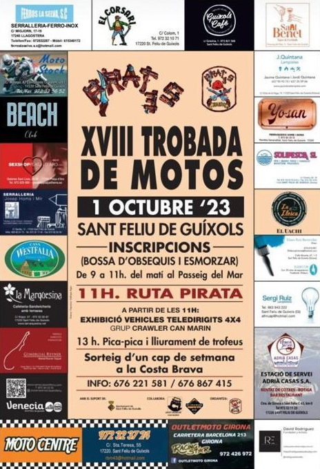 El grup motard Pirates celebra la seva tradicional trobada de motos aquest diumenge 1 d’octubre, arribant aquest any a la 18a edició. Les inscripcions es podran fer al Passeig del Mar de 9 a 11 del matí, on també s’entregarà la bossa d’obsequi i es celebrarà un esmorzar.